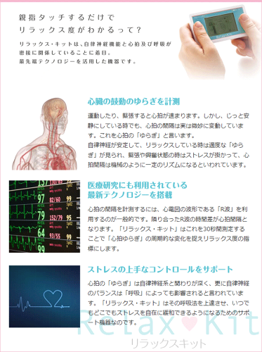 2013年8月20日放送:日テレ「ZIP!」内で【リラックスキット】が紹介されました! ■ リラックス度(ストレス)チェック&腹式トレーニング「リラックスキット」 【メール便可¥320】 いつでも、どこでもリラックスコントロール! まず自分では認識しづらい“ストレス”の度合いを数値で確認し、 次にリラックス状態へと導く腹式呼吸のトレーニングを行い、 この【チェック&トレーニング】を繰り返し行うことで、ストレスを コントロールすることができるようになります。